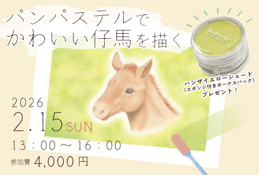 「パンパステル」をメインに使い、仔馬をモチーフにやさしいふんわりとした雰囲気のパステル画を描きます。講師の作成した下図を使用し、手順ごとに丁寧に解説いたします。パステル画を始めてみたい初心者の方から、パンパステルを使ってみたいけれど使い方がわからない、といった中級者の方にもおすすめの講座です🔰今回参加いただいた方には、パンパステル ハンザイエローシェード(スポンジ付きボーナスパック)をプレゼント!